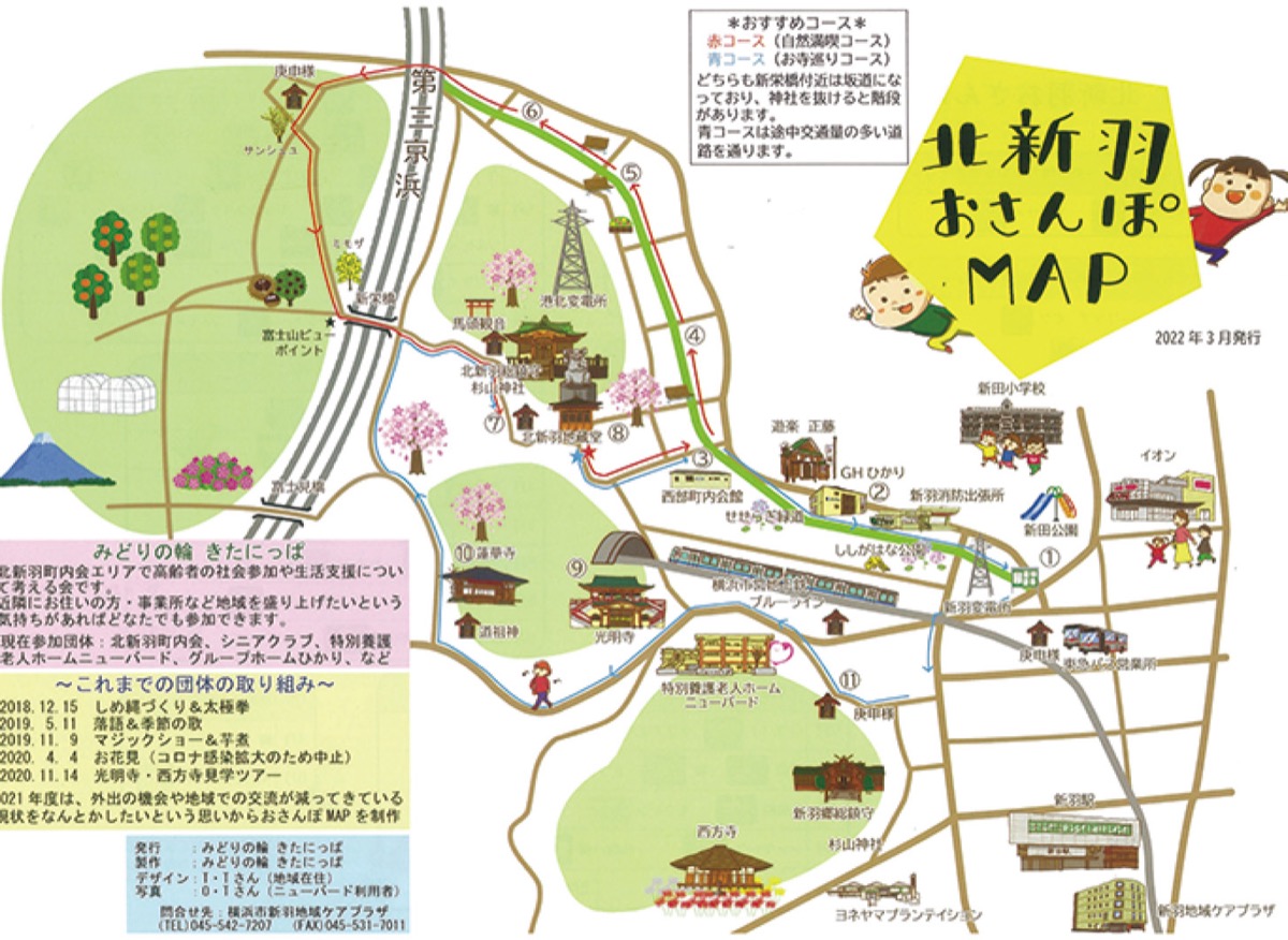 北新羽町内会エリアで活動し、高齢者の社会参加や生活支援について考える地域団体「みどりの輪 きたにっぱ」はこのほど、おさんぽMAPを完成させた。5月にはMAPを元にしたウォーキングを企画し、特に高齢者が地域で元気に交流できる場を創出する。