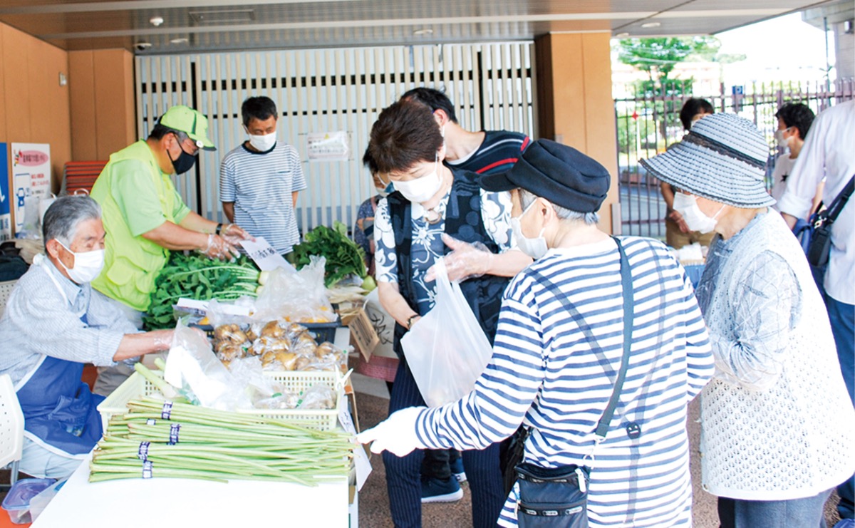 月に一度、28日に開かれる「新羽市」が始まったのは昨年11月。これまでのようにひっとプラン港北の活動費はないため、畑の使用料や農作物の種代、肥料、耕運機のガソリン代などをねん出するため、余剰作物の販売を企画したという。「コロナ禍で少なくなった交流の場にもなる。野菜は一袋100円を基本に販売し、会場は地域ケアプラザの一角を借りられるか施設に相談しました」と尾出会長。新羽地域ケアプラザの水村志津子所長は「地域福祉への寄与として近所の人と触れ合う機会の創出を考えて頂いたのがよかった。会場は屋外なので、コロナ禍でも開催可能と判断した」と話す。この企画が非常に好評だったため、定期化することとなり、さらにメンバーの発案で、コロナ禍で作製物の販売場所が少なくなっている障害者地域作業所等と一緒に販売をすることになった。