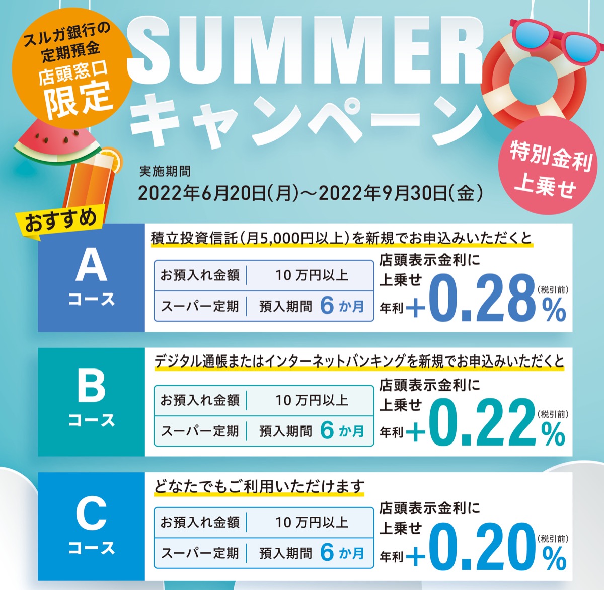 スルガ銀行の店頭限定で、早くも大好評の定期預金「サマーキャンペーン」。新たな資金でスーパー定期(6カ月)に預けると、9月30日(金)までの期間限定で特別金利を上乗せしてもらえる。