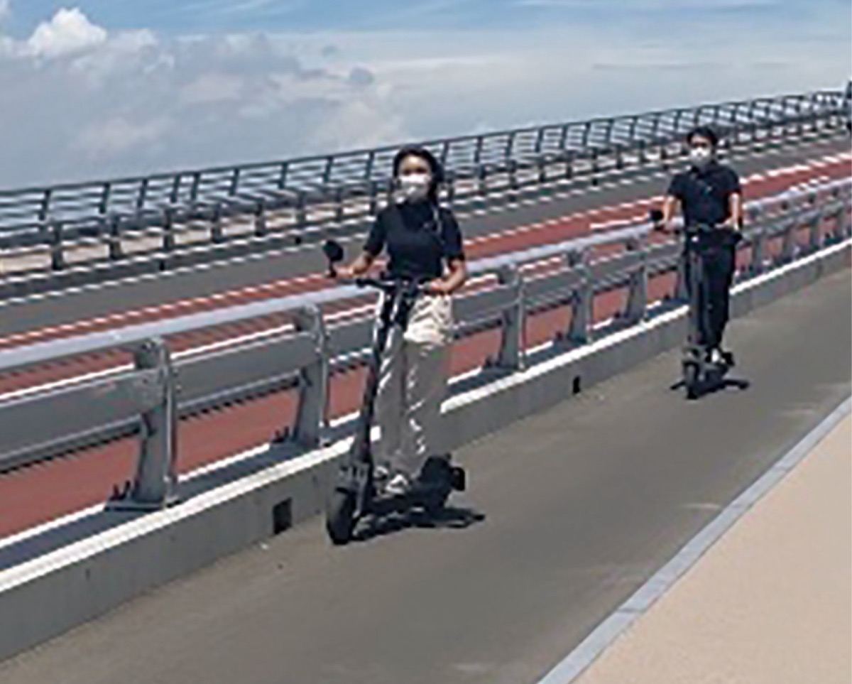 協定締結後の取組みの第一弾として、7月28日には川崎市で電動キックボードのシェアリング実証実験を開始した=写真。2024年頃までを予定。