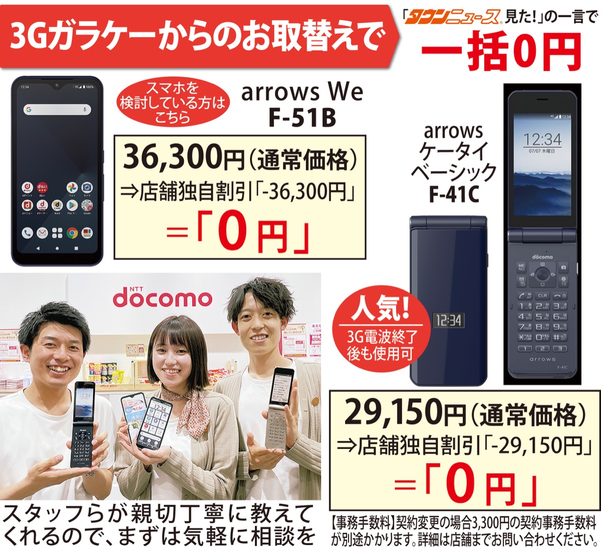 従来の携帯電話(ガラケー)の一部で使用している「3G電波」が、順次終了を迎えている。この機会にスマホへの乗り換えを検討している人には『ドコモショップ』がオススメ。新横浜駅前店では、ガラケーから機種変更時に「TN(タウンニュース)を見た」の一言で、3G電波終了後も使える折り畳み携帯など、人気のスマホ=写真=が”0円”になるキャンペーンを実施している(各限定10台)。