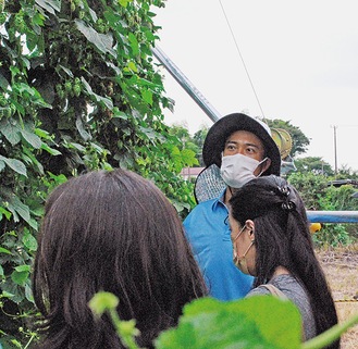 「農業の魅力を広く知ってほしい」--。そんな思いで企画されたホップ栽培見学ツアーが高田町の農家、古川原農園を舞台に行われた。コロナの影響で1年越しの実現。8月6日のツアーに参加した約30人は、ビールの原材料の一つとなる生のホップの摘み取りも体験し、思い思いにその感触や香りを確かめていた。