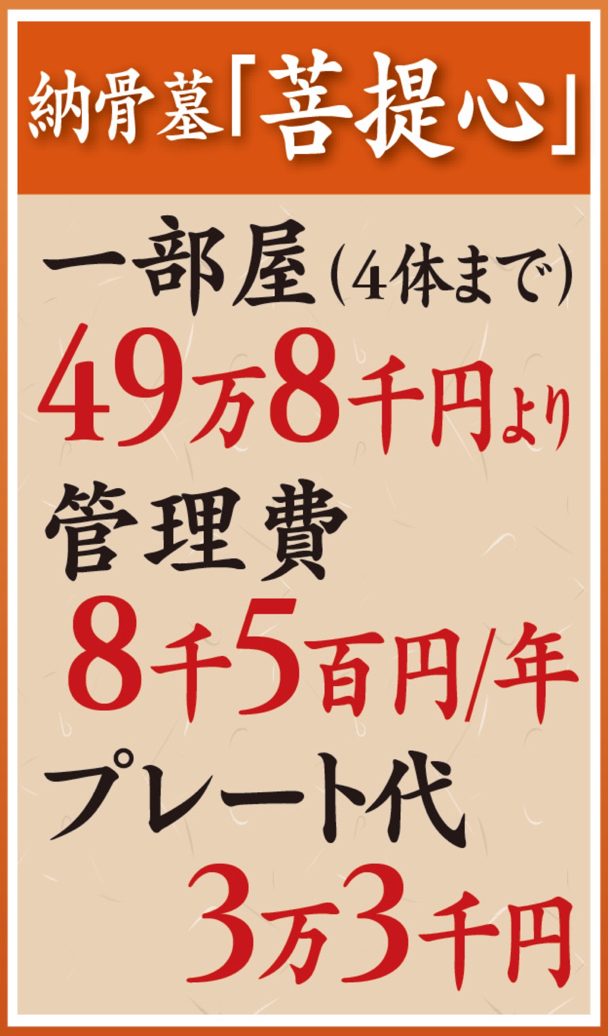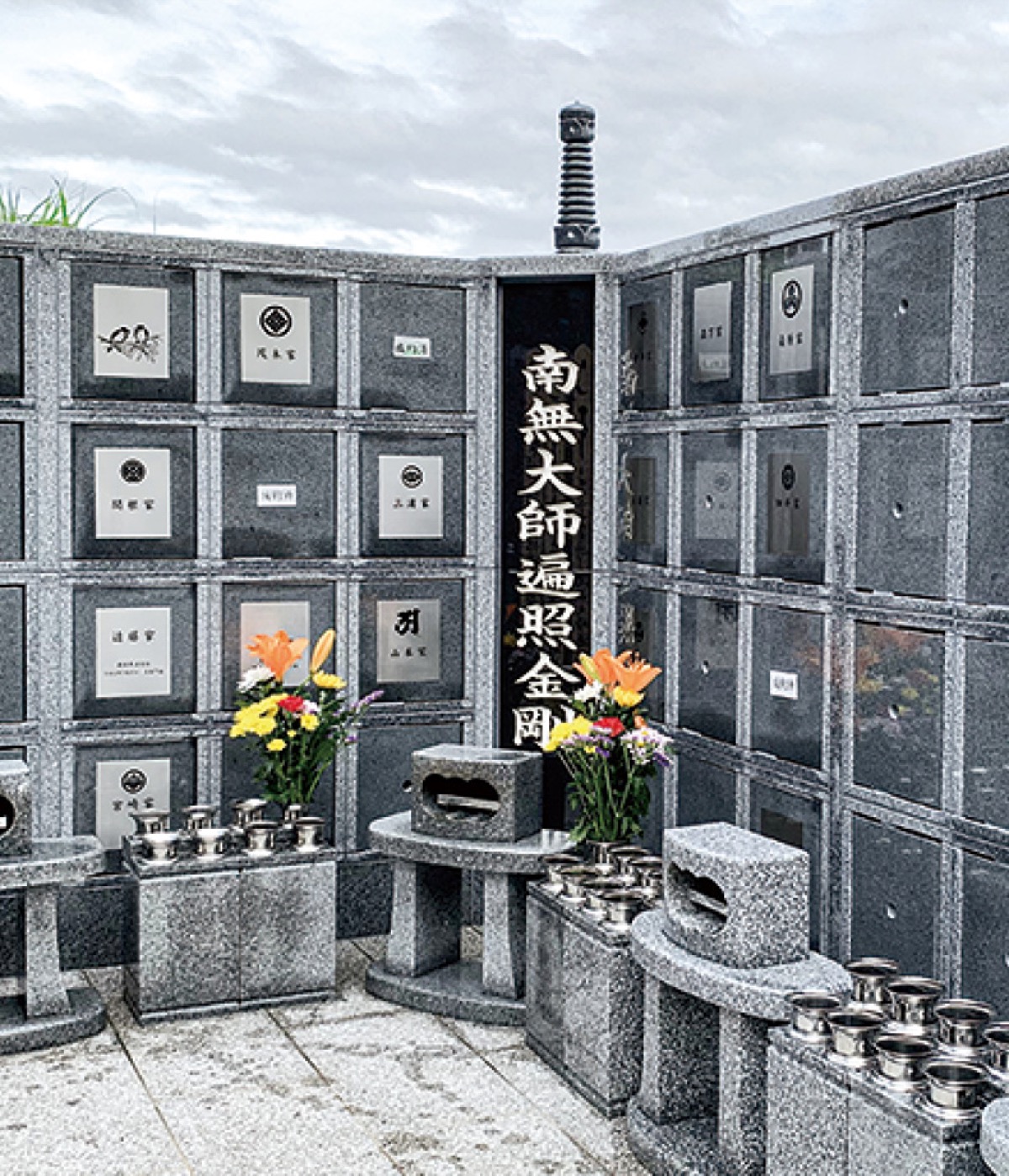 同寺院では、お墓が欲しいが「後継者がいない」「ゆくゆくは墓じまいしたい」人のために『納骨墓』(実用新案取得)と『永代供養墓』を用意。『納骨墓』の場合、後継者没後、遺骨は永代供養墓に合祀され、以後寺院で供養と管理を行う。また一般墓地は、永代使用料・墓石込みで99万円〜。どちらも過去の宗派は不問だ。