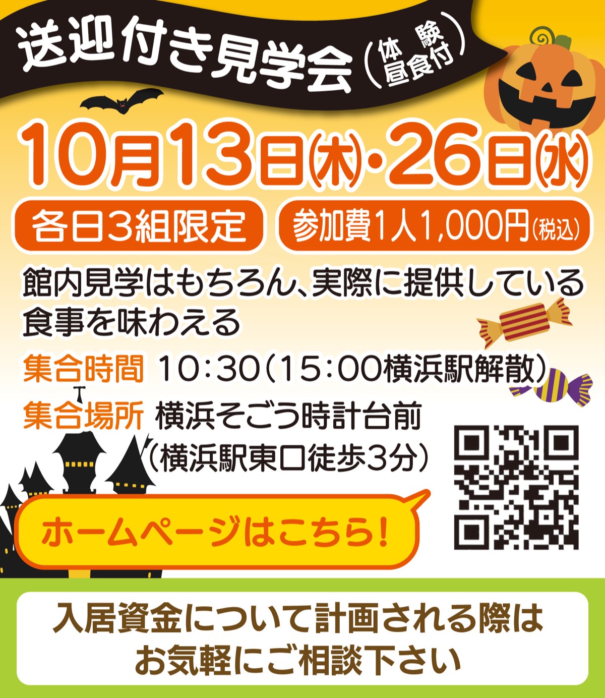 大きな特徴の一つが入居者の自立意識が高い点。毎日を意欲的に生活している人が多く、横浜の中心街へも近いので、現在の住まいと変わりなく都市型の暮らしを続けられる。全室南向きの居室には緊急コールやチェックセンサーを完備。24時間体制で看護・介護職員が常駐するケアセンターもあるので安心だ。施設内はホテルのようなラウンジや大浴場、図書室などの共有設備が充実している。ビリヤードや卓球、囲碁などのサークル活動やカルチャー教室なども多彩。10月13日(木)・26日(水)には送迎付き見学会(体験昼食付)を実施する。まずは気軽に問い合わせを。