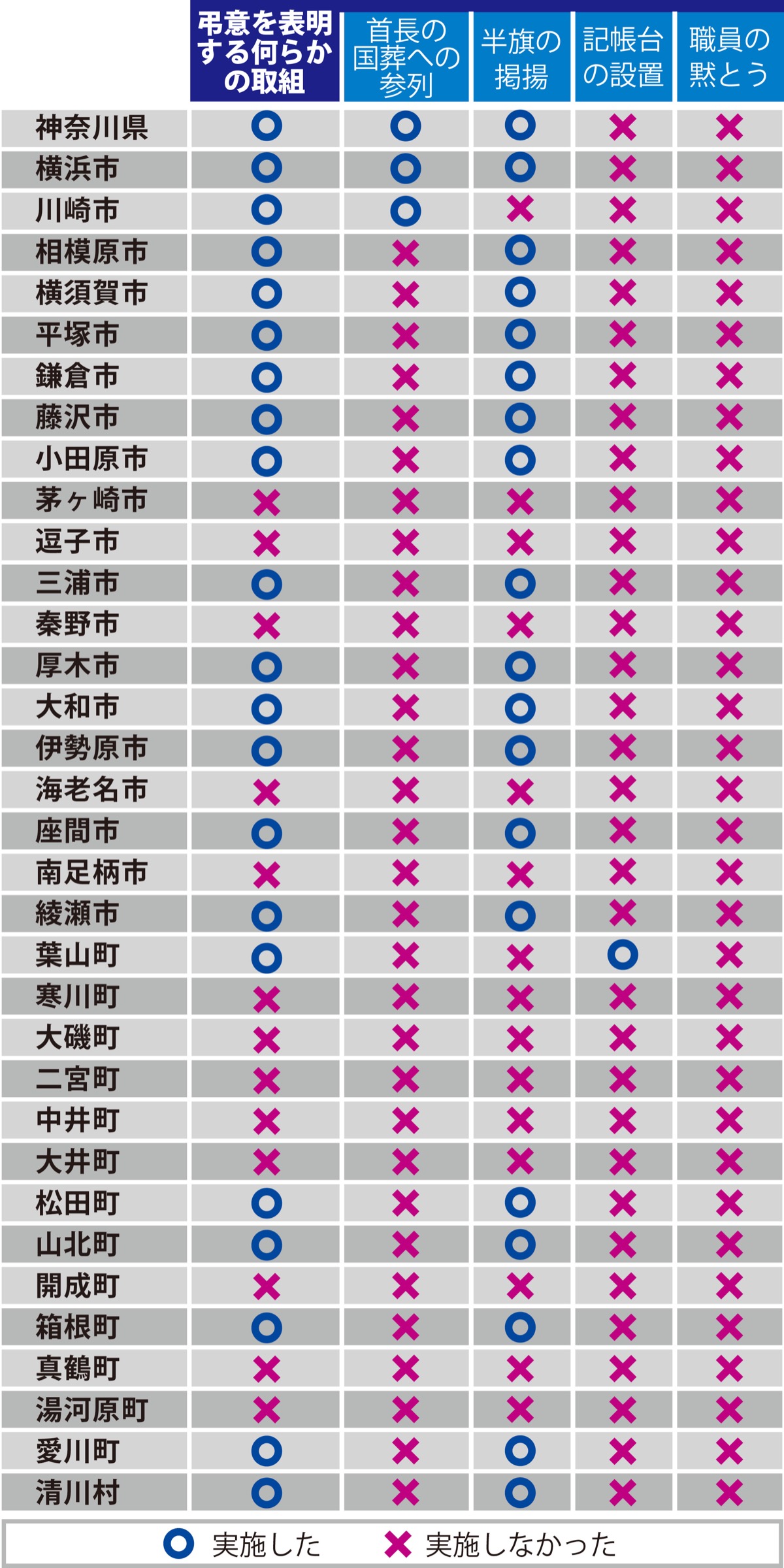 自治体として弔意表明に関する規定や基準を設けているのは川崎市と大和市の2市だった。