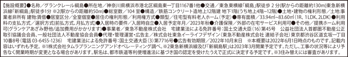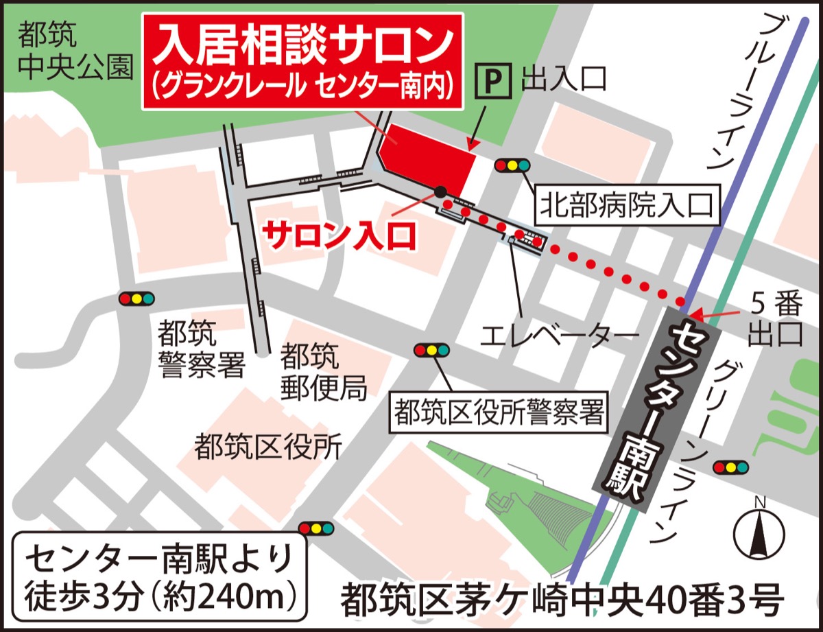 現在「グランクレール センター南」内の入居相談サロン(右下地図)で事前案内会を開催中。居室費用と月額費用の予定価格の提示と、入居意向の受付も始まっている。事前案内会の申込や資料請求は下記まで。