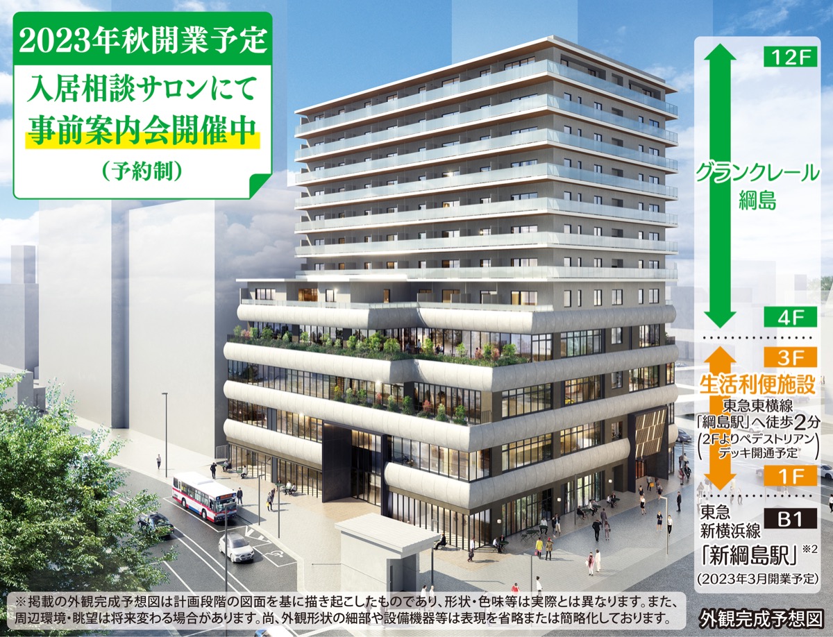 東急不動産HDグループが総力を結集するシニア住宅「グランクレールシリーズ」。その中でも首都圏初(※1)となる駅直結型有料老人ホーム「グランクレール綱島」が来年秋に開業する。
