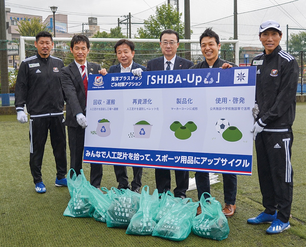 そこで今回タッグを組むのが、クラブのホームタウンのひとつである横須賀市。「海洋都市横須賀」を掲げ、20年から「海洋プラスチックごみ対策アクション宣言」を表明している同市と連携し、人工芝のごみ(人工芝片)からスポーツ用品を生成する事業として「SHIBA-Up」を始動した。