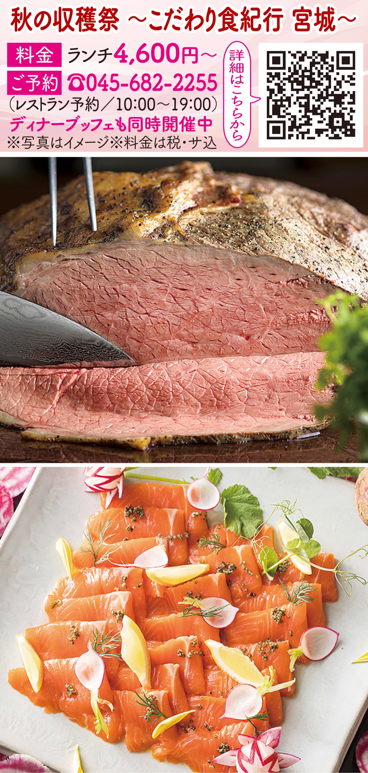 みなとみらい駅直結の横浜ベイホテル東急2階「カフェ トスカ」では、食材王国「みやぎ」のたくさんの魅力ある食材を使用したランチブッフェを開催している(11月30日(水)まで)。目の前で調理する人気のアクションコーナーでは「蔵王クリームチーズ」を用いたパスタや、定番人気の「ローストビーフ」、気仙沼産フカヒレのソースとともに味わうホテル自慢のふわふわ卵の「オムライス」などを楽しめる。みなとみらいの景色を望む開放的な空間で「実りの秋」にふさわしいメニューの数々を満喫してみては。