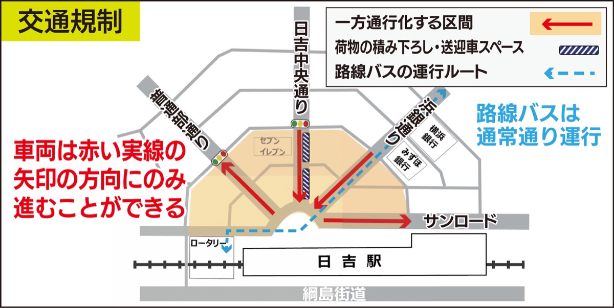 社会実験で一方通行化される道路は、サンロード、浜銀通り、日吉中央通り、普通部通りの日吉駅西口付近のエリア(地図参照)。サンロードと普通部通りでは、三角コーンを設置し車道幅を狭め、歩行者空間を広げる。対象区間内での荷物の積み下ろしや送迎などは日吉中央通りの指定のスペースで行う。浜銀通りでは、路線バスは通常通りの運行となるため、路線バス以外の車両を一方通行化することで、歩行者空間にゆとりを持たせる。