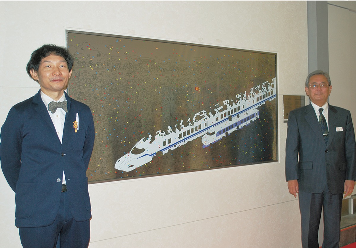 「新横浜×新幹線」をテーマに描かれたイラストは、市内在住で新横浜にゆかりのある、イクタケ氏が自らもアイデアを出した。パネル材は、引退した東海道新幹線700系車両のリサイクル建材を使用した。藤川社長は「10周年の記念に残るものをと考えたパネル。イクタケさんに楽しい絵を描いていただき、これから地域の皆様に愛していただければ」とあいさつ。イクタケ氏は「イラストレーター以前は、区内新吉田小学校の教諭だった。そんな思い入れもあり、今日は嬉しくて涙が出そう」と語った。