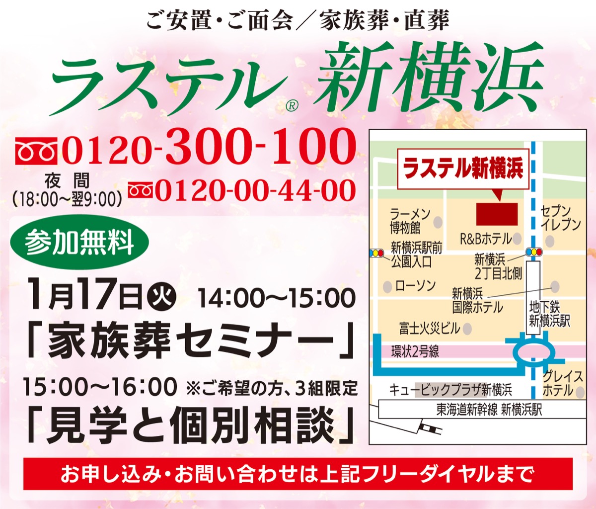 新横浜駅北口8番出口すぐにある、家族葬専門式場「ラステル新横浜」で1月17日(火)午後2時〜3時、『ラステル終活セミナー』が開かれる。参加無料。申し込み先着順。