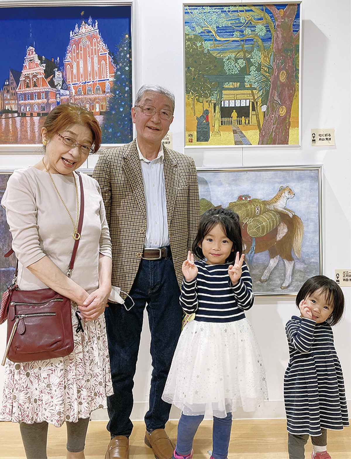 「杜に祈る」=写真右上=を制作した片山芳洋さん(74)は、通い始めて8年目。自宅の前にある神社で孫娘2人と自身が祈る様子を描いた。初めて大きいサイズ(F20号)で制作し、1年かけて完成させた。同展の通知が思っていたよりも早く来たため、「こんなに早く来たなら落ちたかもと思ったけれど、入賞だったのでホッとした」と振り返る。孫2人が会場で作品を鑑賞し「自分たちが映っていて喜んでいた」と微笑んだ。