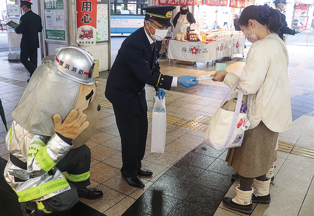 港北署では、期間内の巡回で住宅火災などへの注意を喚起。12月22日には、区内の東急沿線5駅で火災予防キャンペーンを行った。大倉山駅では、吉田崇署長が市消防局のキャラクター「ハマくん」と一緒に、駅利用者らに啓発グッズなどを手渡した=写真。同署管内では、12月22日時点で、火災発生件数は昨年比9件増の60件。リチウムイオン電池などバッテリー製品の不分別が出火原因の事例も多く注意が必要という。