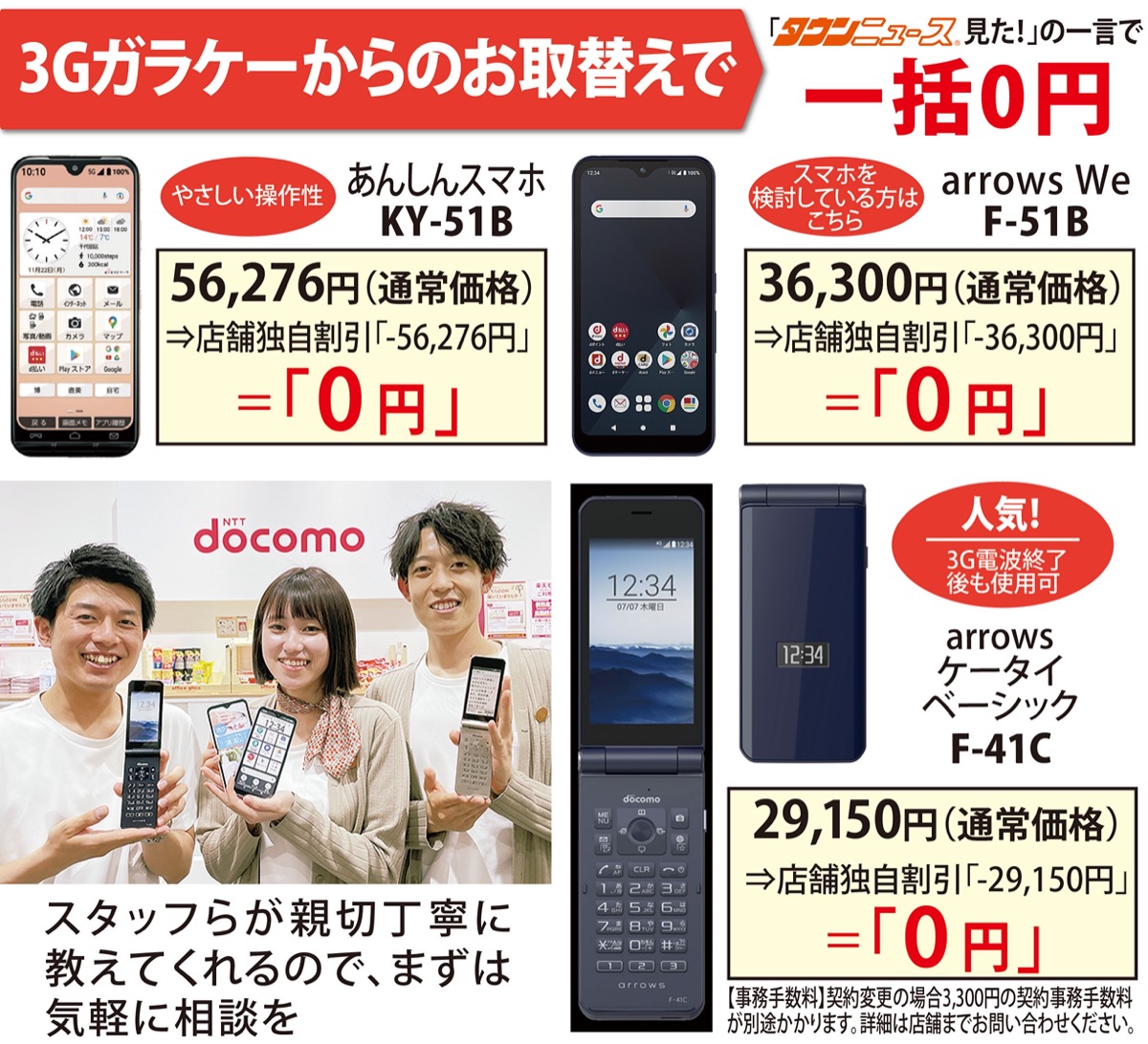 従来の携帯電話(ガラケー)を利用している人へ緊急速報!FOMAプラスエリアが順次終了を迎え、港北区内でも多くのエリアで機種によっては利用ができなくなる。この機に機種の乗り換えを検討している人には『ドコモショップ』がオススメ。新横浜駅前店では、ガラケーからの機種変更をする際に、「タウンニュースを見た」で3G電波終了後も使える折り畳み携帯など、人気のスマホ=写真=が”0円”になるキャンペーンを実施中(各台限定10台)。好評につき、早めの連絡を。
