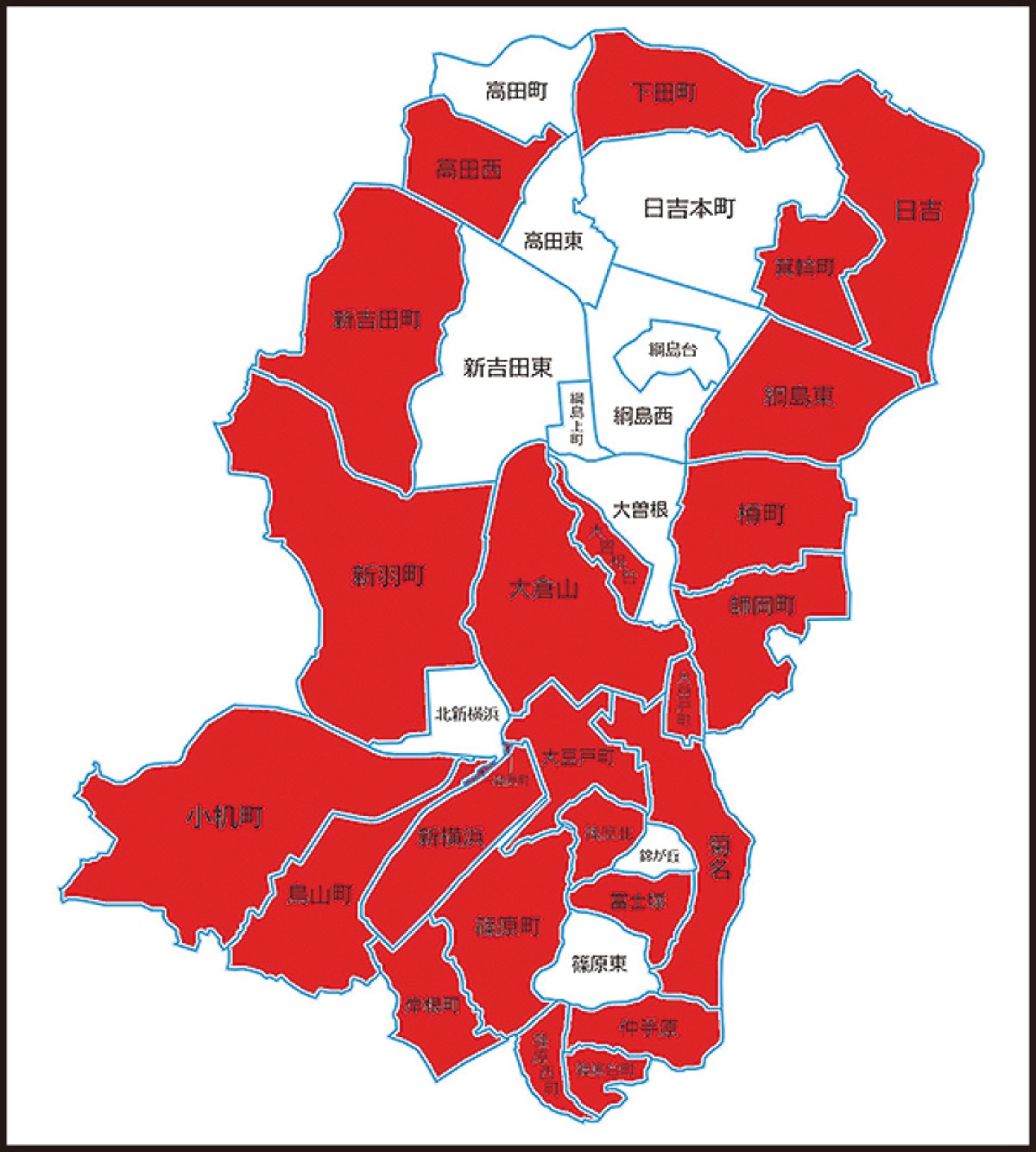 3月以降の港北区内のFOMAプラス非対応エリアは、地図上の赤い地域。同店では、機種選びの相談は当然、スマホ教室等で購入後のサポートも充実。「対象エリアで2つ折りケータイをお使いの方は当店まで」