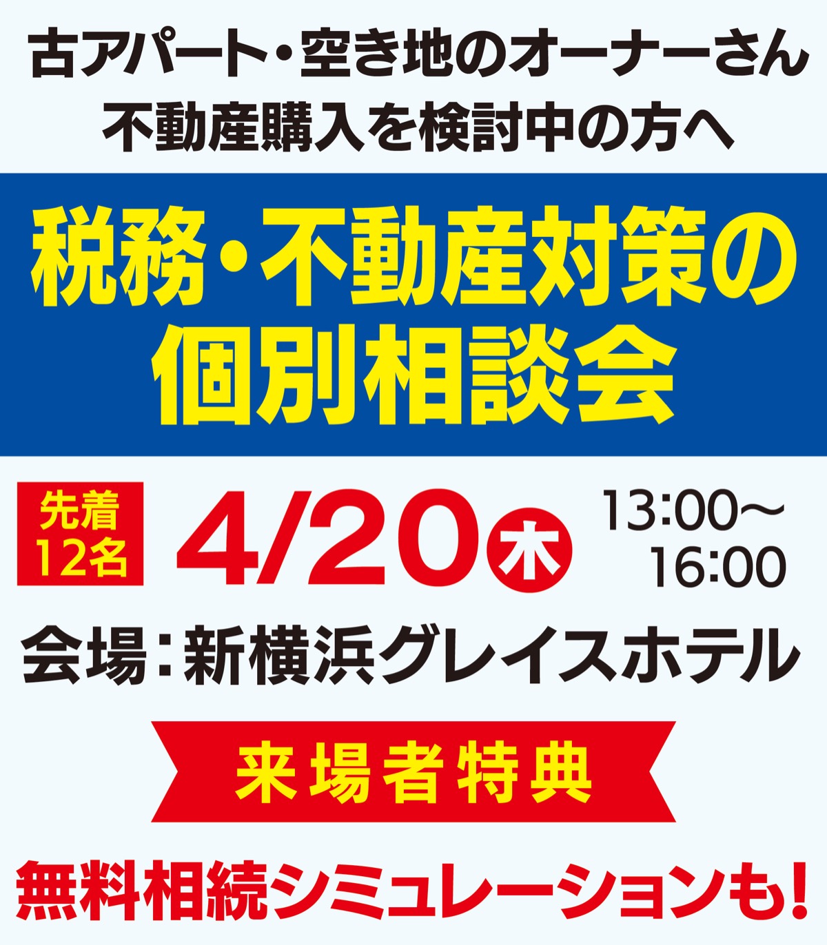 そんな悩みを専門家が解決してくれる「税務・不動産対策個別相談会」が4月20日(木)、午後1時から新横浜グレイスホテルで開催される。