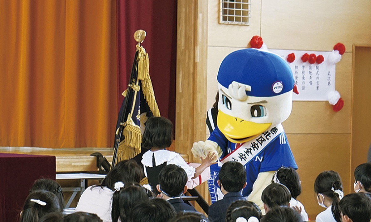 当日は、港北区安全安心大使であるマリノスケ(横浜F・マリノスの公式キャラクター)から、新1年生にプレセント。式の前には、マリノスケ、トリコロールマーメイズ(横浜F・マリノスのチアリーダーズ)、区役所の職員、警察官らによる登校する児童らの見守り活動も行われた。