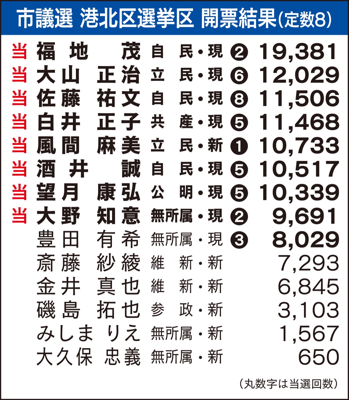 1万9381票を獲得しトップ当選を果たしたのは、得票率が唯一2桁の15・74%となった福地氏。前回を上回る得票数で当確の知らせを受け、「これまでの4年間に対し、さらに頑張れという期待の表れ」と振り返った。2期連続でのトップ当選には「大変多くの票をいただき、身が引き締まる思い。これまで以上に全力で、負託にこたえたい」とし、「これからも地域課題の解決に向け、一歩一歩地道に歩みを進めていきたい」と力を込めた。ほか大山正治氏(立民・現)、佐藤祐文氏(自民・現)、白井正子氏(共産・現)、風間麻美氏(立民・新)、酒井誠氏(自民・現)、望月康弘氏(公明・現)、大野知意氏(無・現)が当選した。