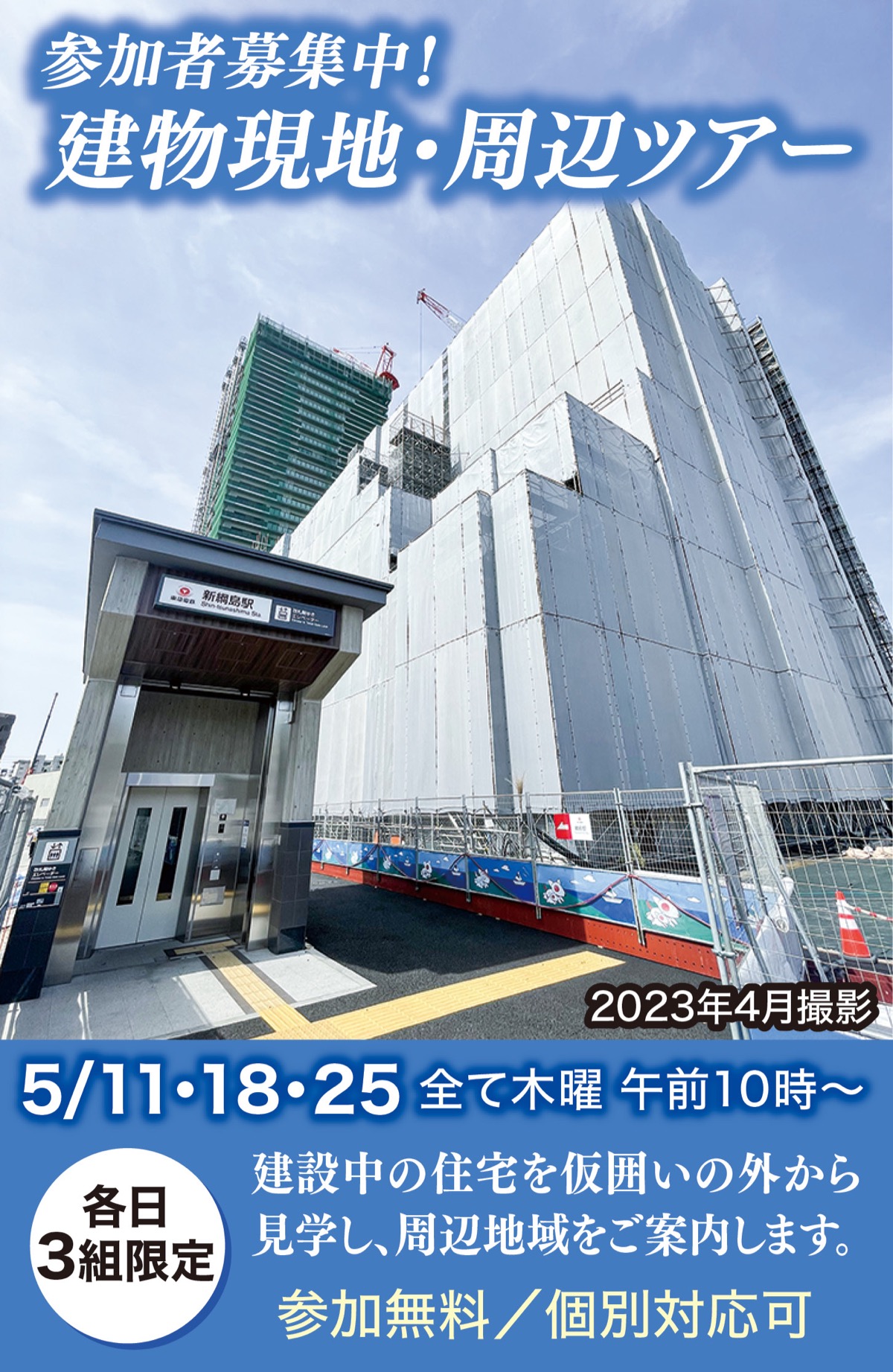 同住宅では、建設中の現地から物件の魅力を紹介する「建物現地・周辺ツアー」を5月11日(木)・18日(木)・25日(木)の午前10時から開催する。かつて温泉街として賑わった綱島エリアや新駅「新綱島駅」の案内も。実際に街を巡ることで、生活イメージを持てるはずだ。
