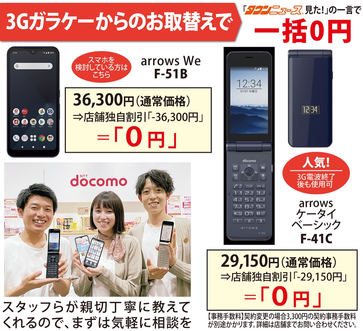 従来の携帯電話(ガラケー)を利用している人へ緊急速報!FOMAプラスエリアが順次終了を迎え、港北区内でも多くのエリアで機種によっては利用ができなくなる。この機に機種の乗り換えを検討している人には『ドコモショップ』がオススメ。新横浜駅前店では、ガラケーからの機種変更をする際に、「タウンニュースを見た」で3G電波終了後も使える折り畳み携帯など、人気のスマホ=写真=が”0円”になるキャンペーンを実施中(各台限定10台)。好評につき、早めの連絡を。