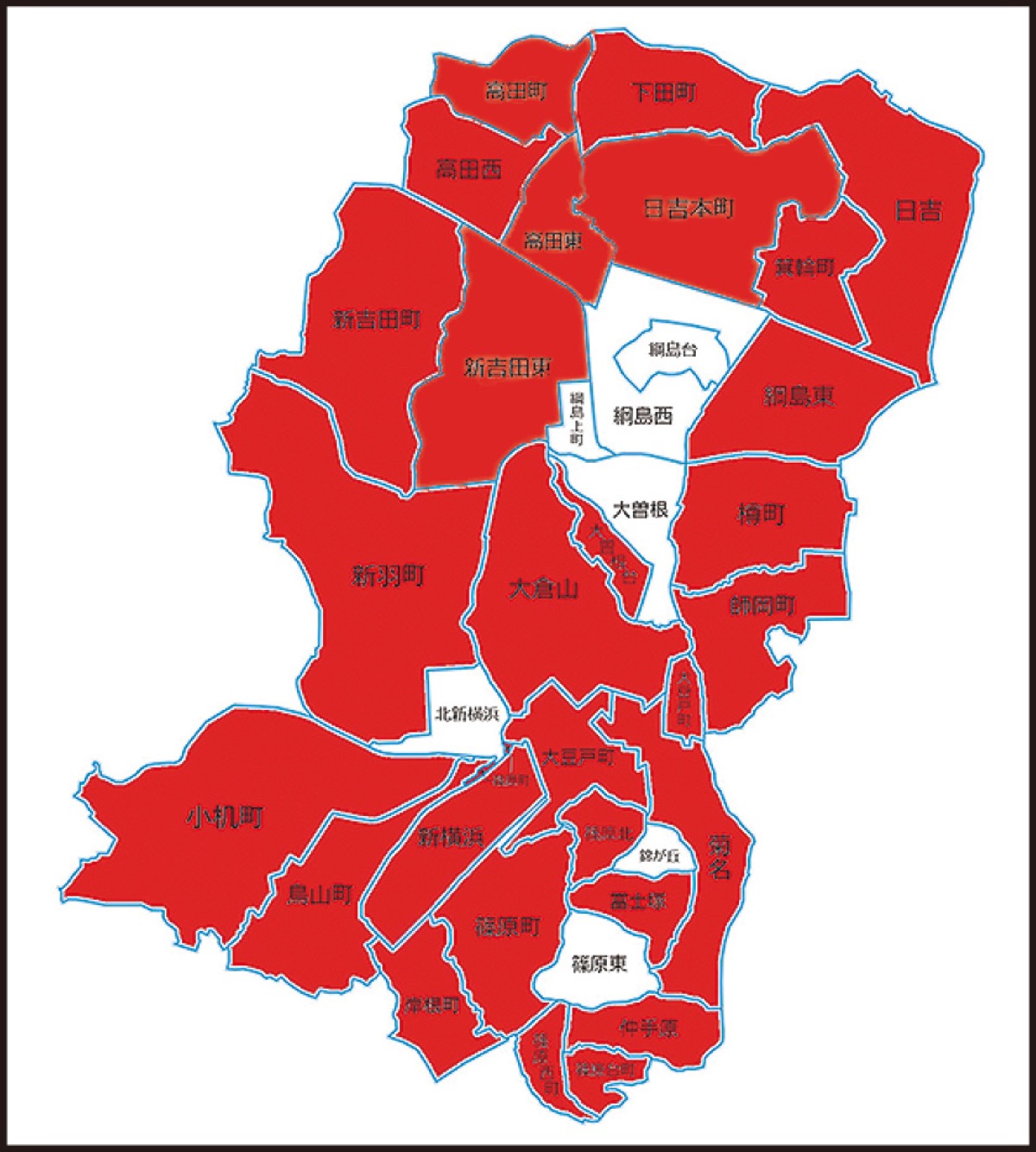 5月以降の港北区内のFOMAプラス非対応エリアは、地図上の赤い地域。同店では、機種選びの相談は当然、スマホ教室等で購入後のサポートも充実。「対象エリアで2つ折りケータイをお使いの方は当店まで」