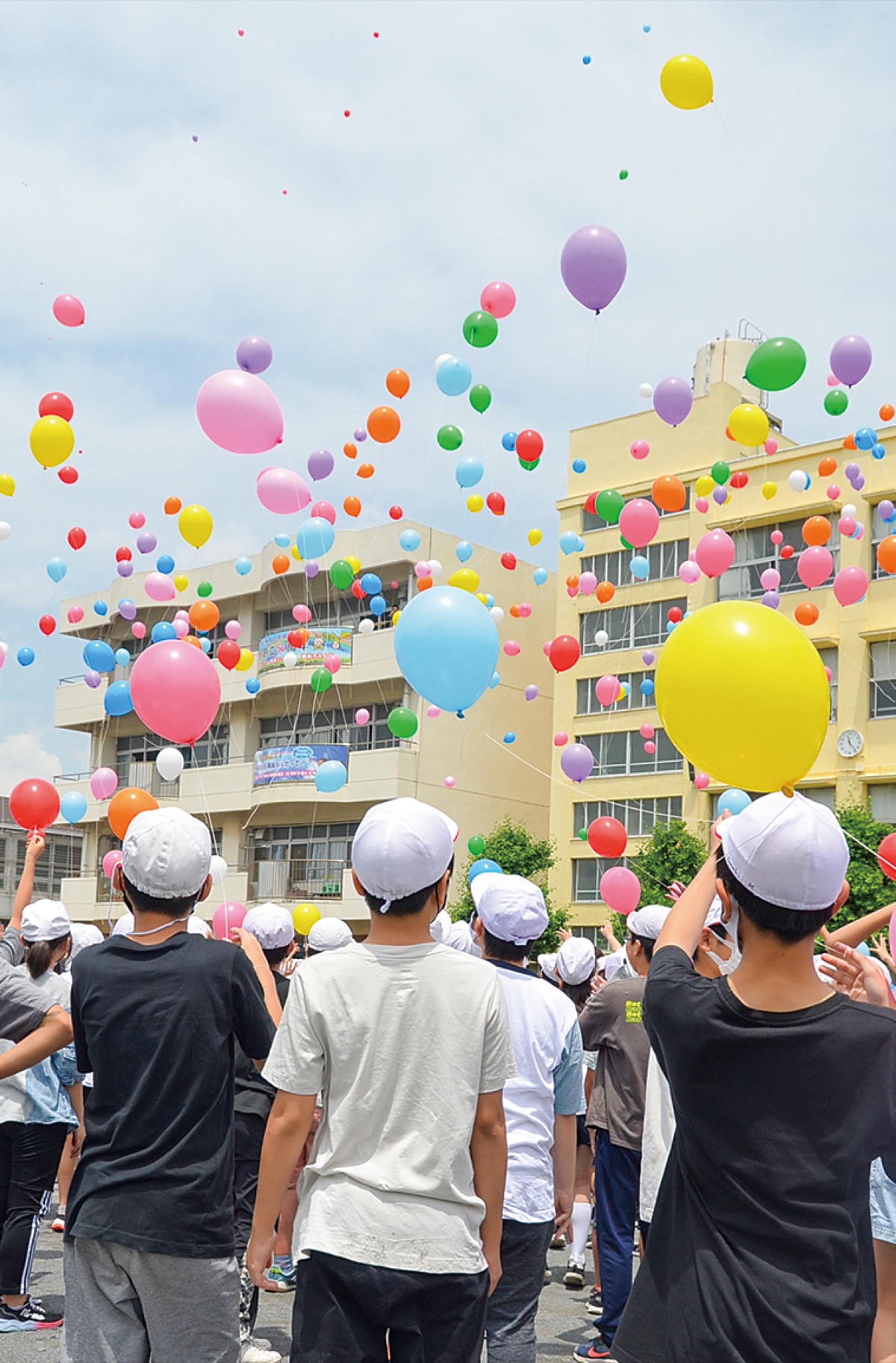 ドローンによる航空写真や集合写真の撮影を終えた児童一人一人に手渡されたのは、赤や黄色、水色など色とりどりの風船。掛け声に合わせて児童らが一斉に手を離すと、風船は空高く舞い上がった。児童は、次第に小さくなっていく風船をいつまでも見つめ、時折手を振るなどしていた。