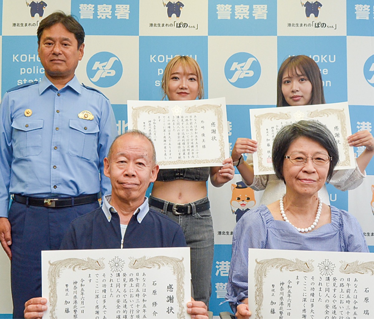 港北警察署(加藤秋人署長)は6月1日、外出したまま所在不明となっていた区内在住の80代女性を保護したとして、神奈川区在住の石原修介さん(71)・瑞江さん(61)夫婦と、ともに専門学校生で同区在住の米村菜乃さん(19)、旭区在住の外崎優美さん(19)を表彰した。