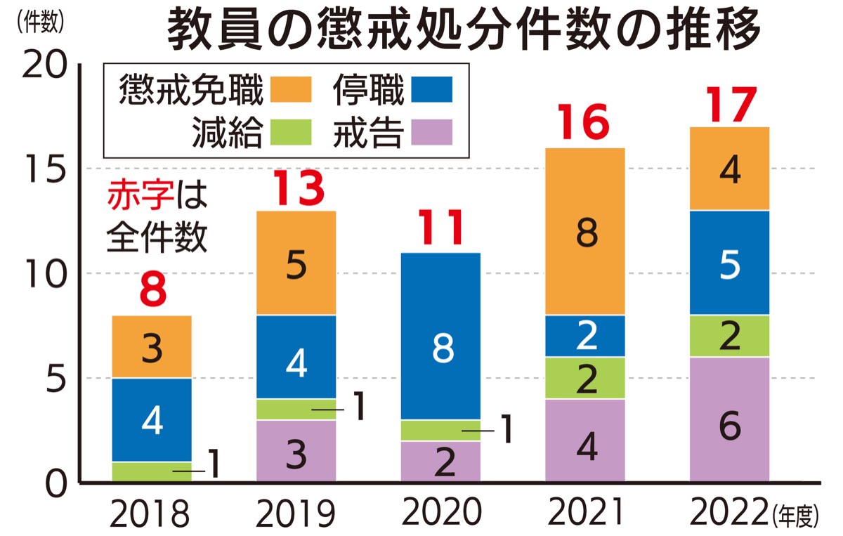 年度ごとの処分件数を見ると22年度17件、21年度16件、20年度11件、19年度13件、18年度8件。処分理由別に見ると、この間の最多はわいせつで18件。セクハラ9件、不適切な指導8件、窃盗7件、体罰6件と続いた。
