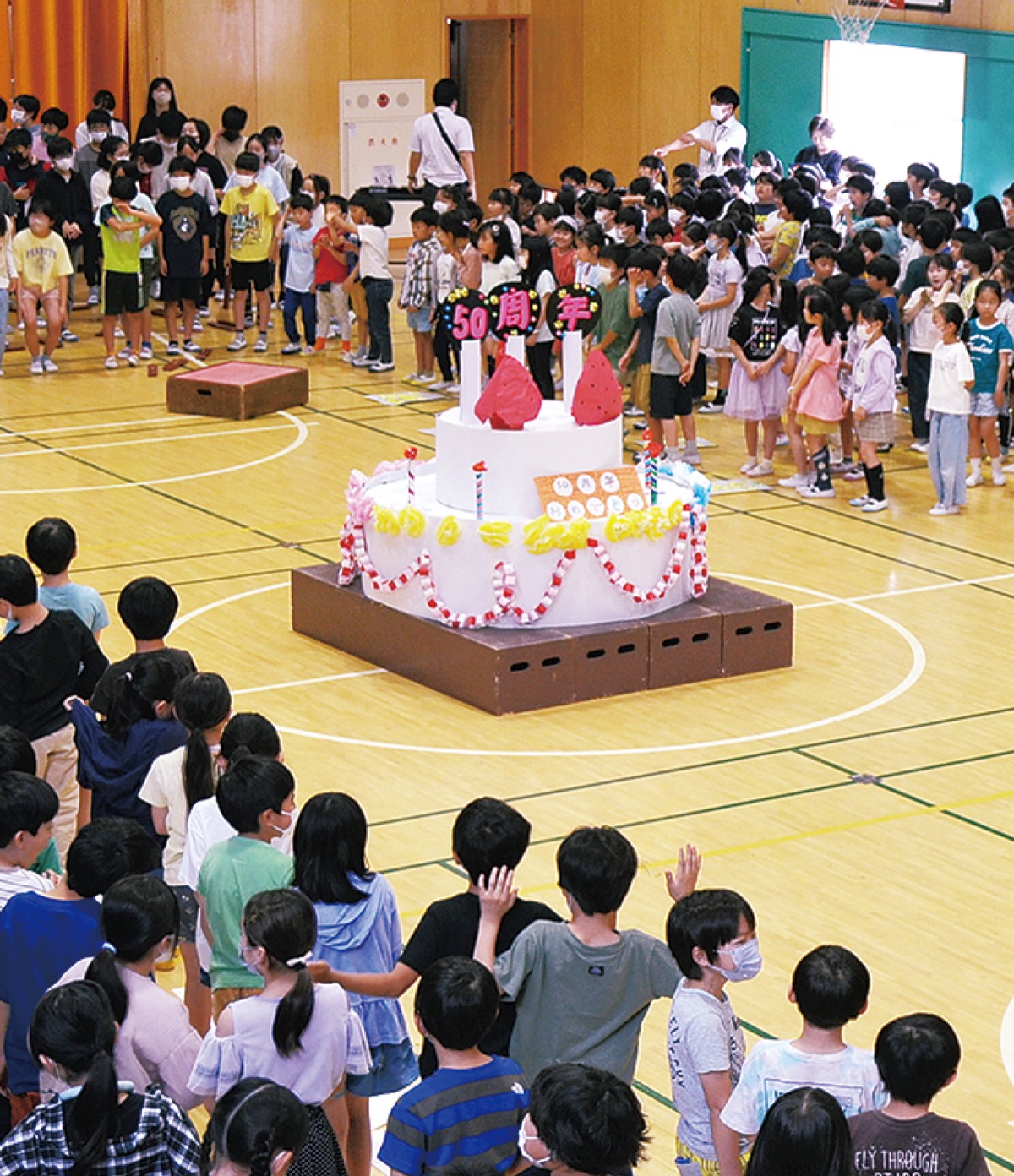 創立50周年を迎え、様々な取組みが企画されている市立駒林小学校(西尾武泰校長)で6月23日、開校記念集会が開かれ、翌日に控えた同校の誕生日を児童らが手づくりの段ボール製ケーキで祝った。