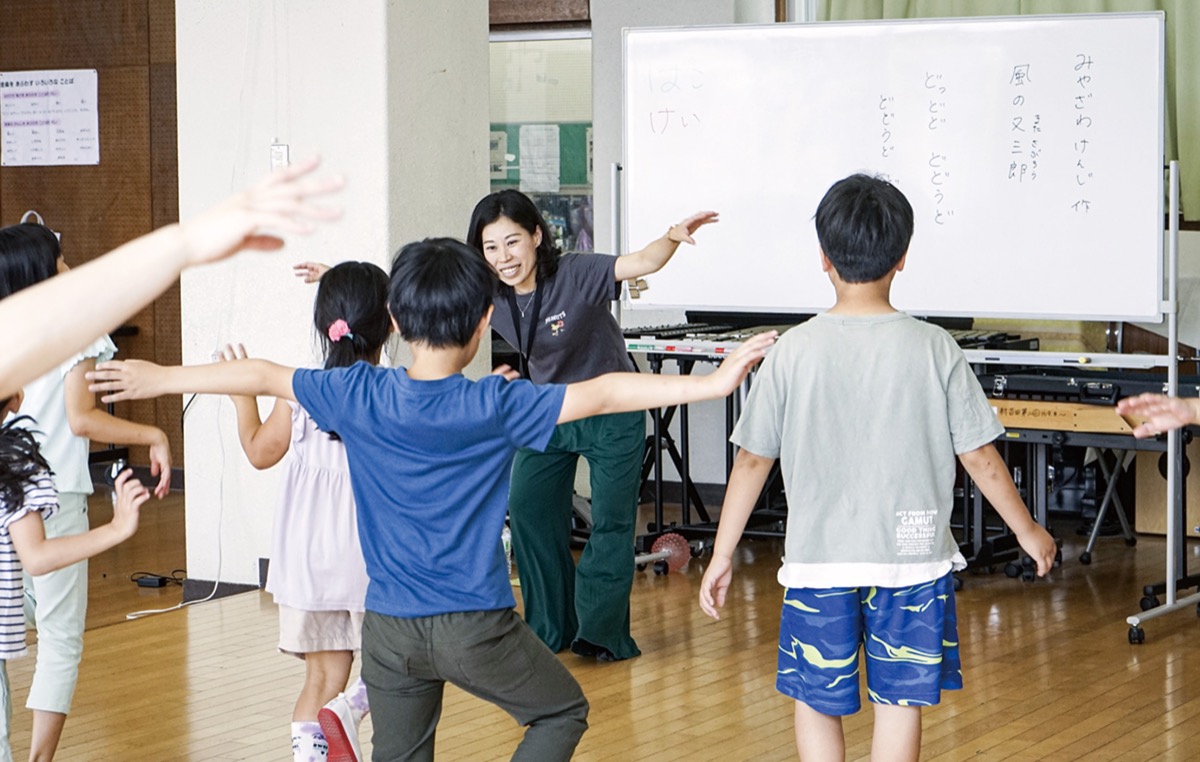 箱田さんと高橋さんの声や体の動きを真似することで、「声の表現」を体感した児童。授業の後半には4人1組となり、宮沢賢治の「風の又三郎」の一部を用いて、風の動きを想像して発表した。腕を大きく振るグループや、飛び跳ねるグループなど、想像した風の動きはグループそれぞれ。授業が終わると、「まだやりたい」という声が聞こえた。参加した児童は、「体いっぱい動かして楽しかった」と嬉しそうに感想を口にした。
