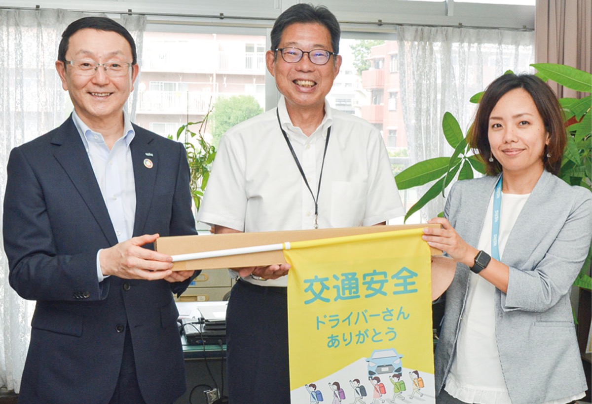 同社では交通事故防止の取組みの一環として、希望した神奈川県内211の小学校に横断旗2050本(同小を含む)を贈呈しており、代表して同小学校で贈呈式を行った。