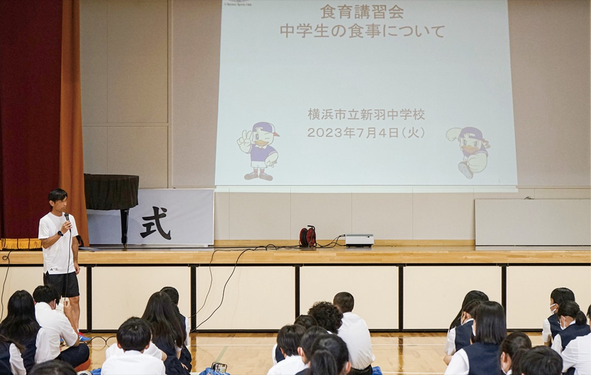 横浜市立新羽中学校(豊澤尚弘校長)で7月4日、(一社)F・マリノススポーツクラブの望月選理事による食育講話が行われた。同校ではこれまでに、100粒の大豆を自分の手で土に蒔き、育て、観察し、加工し、食べる「大豆100粒運動」や、保護者を交えた食についての意見交換会など、食育活動をしてきた。