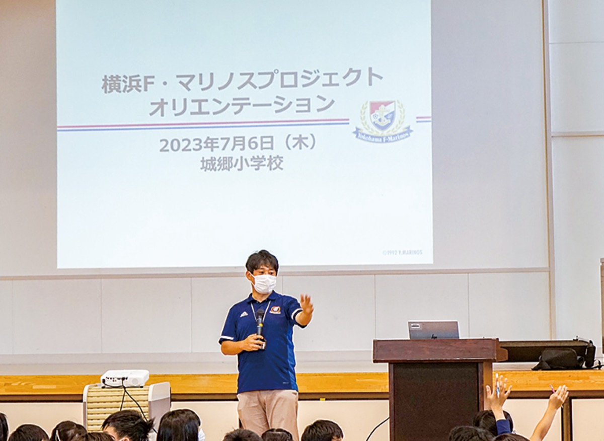 今回はオリエンテーションとして、(一社)F・マリノススポーツクラブ地域連携部の芝崎啓さんが講師となり、同クラブについて説明した。芝崎さんは「子どもたちがマリノスのことについて考えてくれることが楽しみ」と期待を口にした。児童らの中には「興味がわいた」という声があった。