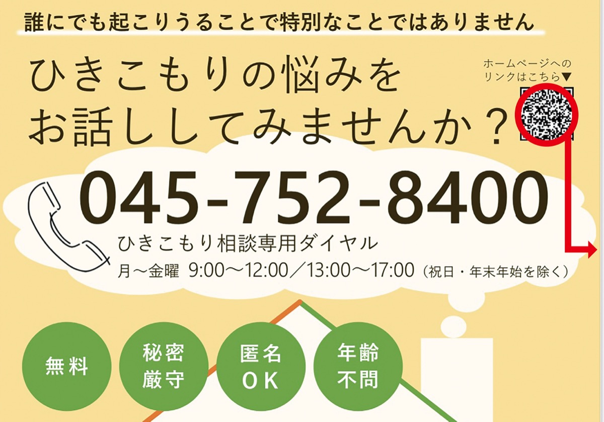横浜市ひきこもり相談専用ダイヤル、ホームページは左から。