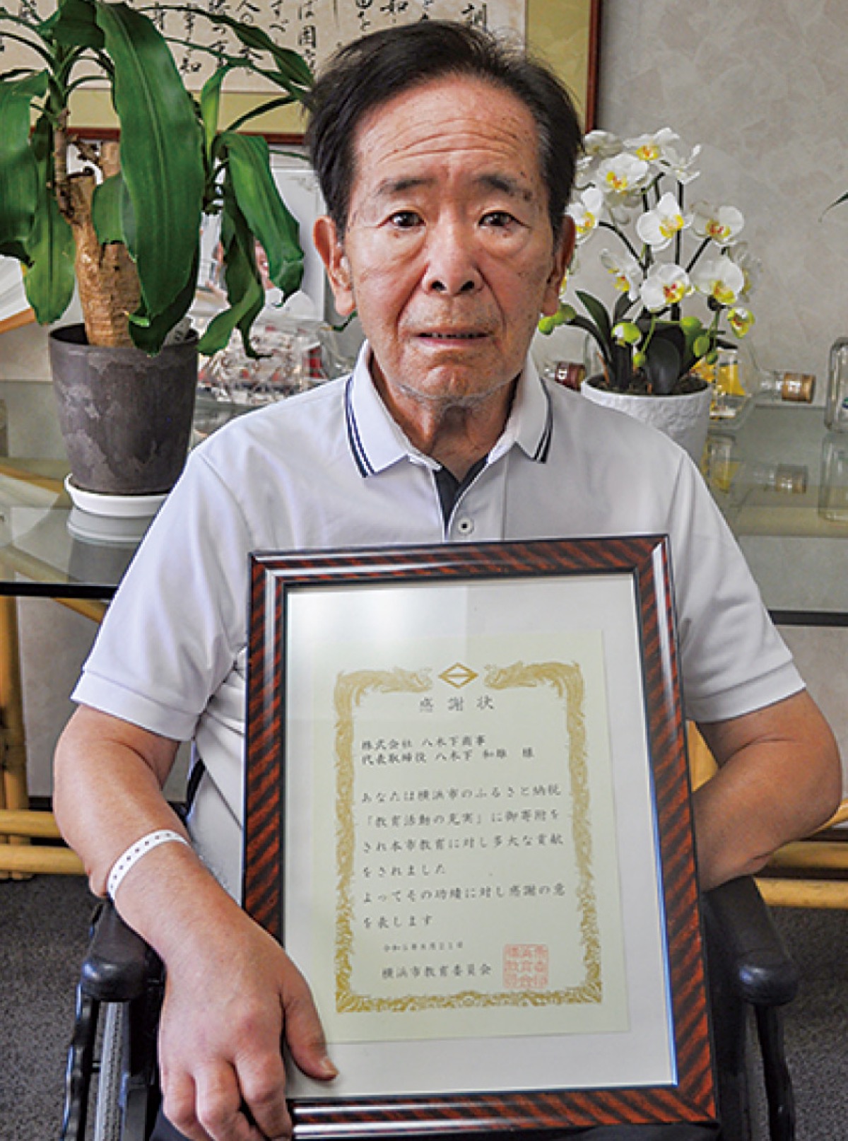 翌日感謝状を手にした八木下社長は「この地に生まれ、長年商売させていただいている。恩返しになれば」と話した。同社は50周年事業として、ほかにも町内会の掲示板(2カ所)設置や鳥山八幡宮参道への手すりの設置、子ども食堂への寄付を行っている。