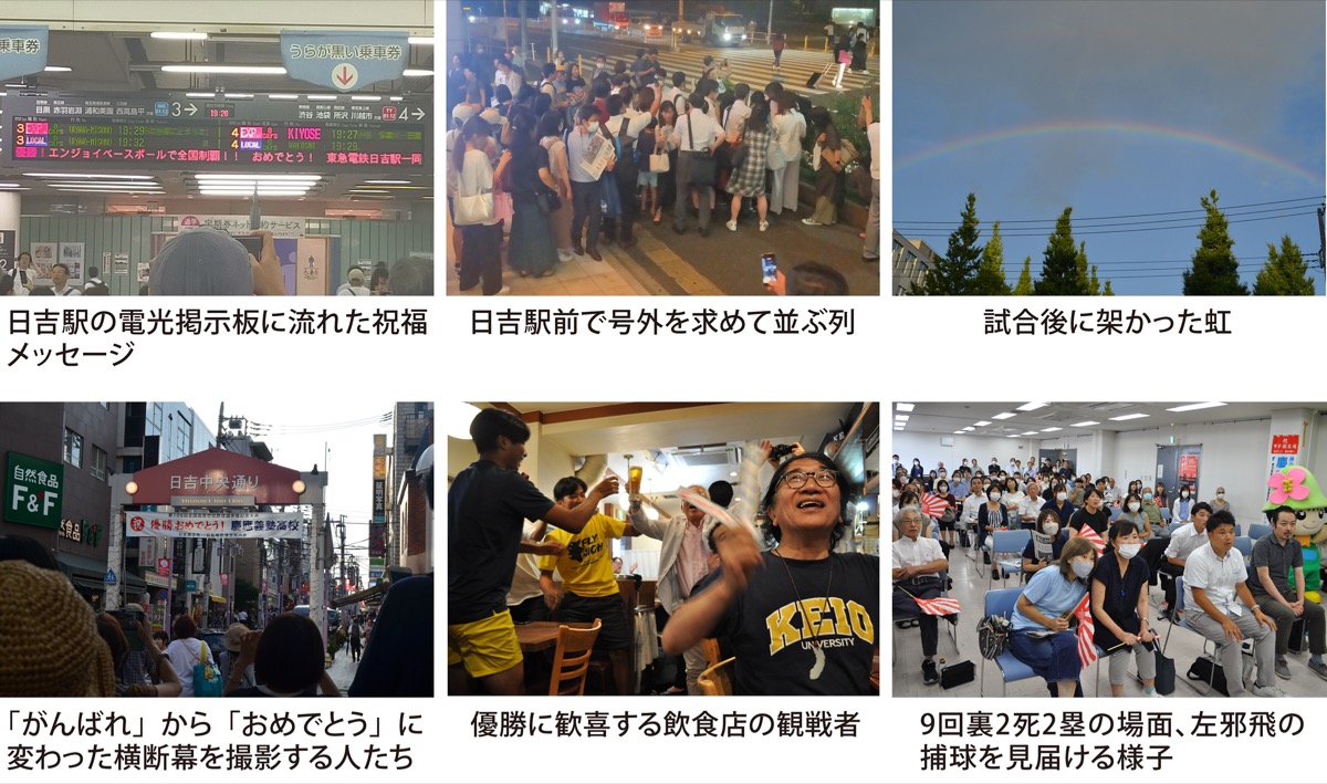 港北区内では、各所で決勝戦を観戦しようと試合時間に合わせて帰宅する人や、特別に午後1時から開店している飲食店で観戦しようと集まる人など、地域ではさまざまな様子が見られた。観戦会場となったそれぞれの場所で観戦者らは、一球一球、甲子園現地にいるかのような緊張感で試合を見届けた。日吉の飲食店では、その場にあった箸袋と色ペンを使って優勝を祈願する応援グッズを即席で作って声援を送る男性や、優勝が決まり慶応の塾歌が流れた場面では、その場にいた人たちと一緒になって合唱する人も。