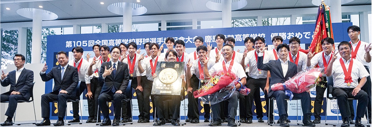 慶應義塾高等学校野球部は9月1日、横浜市役所を訪れ、第105回全国高等学校野球選手権記念大会の優勝報告をした。1916年以来の同部優勝を祝福しようと、1階アトリウムは事前に応募していた横浜市在住、在勤、在学の約300人と、立ち見する人でいっぱいになった。