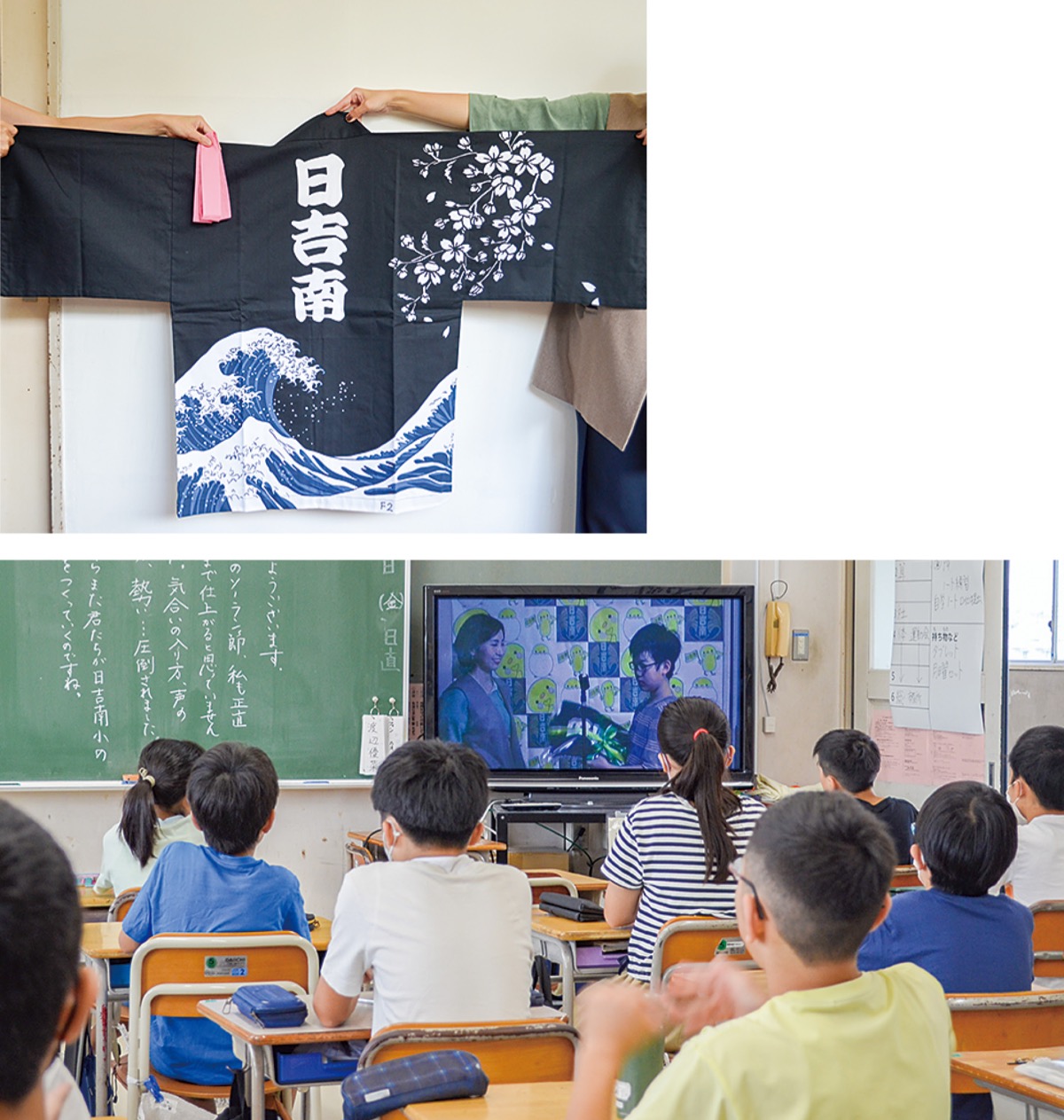 贈呈式は放送室で行われ、各教室に配信。子どもたちは真剣な面持ちで式を見守っていた。実際に長半纏を着た児童が映ると、感嘆の声が上がり一気に盛り上がった。