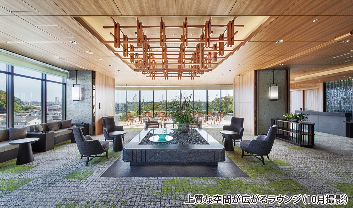 顔認証の自動ドアなど入館時のセキュリティは万全。365日24時間の有人管理も含めて安全安心の環境を整える。4階のラウンジはリゾートホテルのように開放的で、大きな窓やテラスから見える景色も魅力的だ。