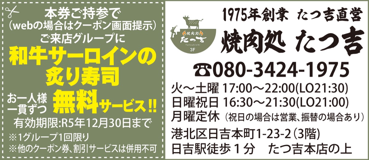 1975年に創業し、日吉の街に根付いている「たつ吉」が、厳選和牛を提供する『個室焼肉店』を本店ビル3階にこの秋、新規オープン。