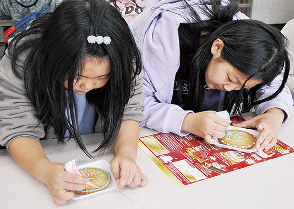 「地域との繋がりを深め、子どもを後押しできるイベントを目指した」と佐々木委員長。地域の洋菓子店や食堂、工務店なども参加し、様々なブースが設けられた。クッキーのデコレーションや工作体験など、子どもたちは楽しそうに会場を回っていた。同校卒業の中学生や保護者などボランティアも集まり、地域全体で周年を祝った。
