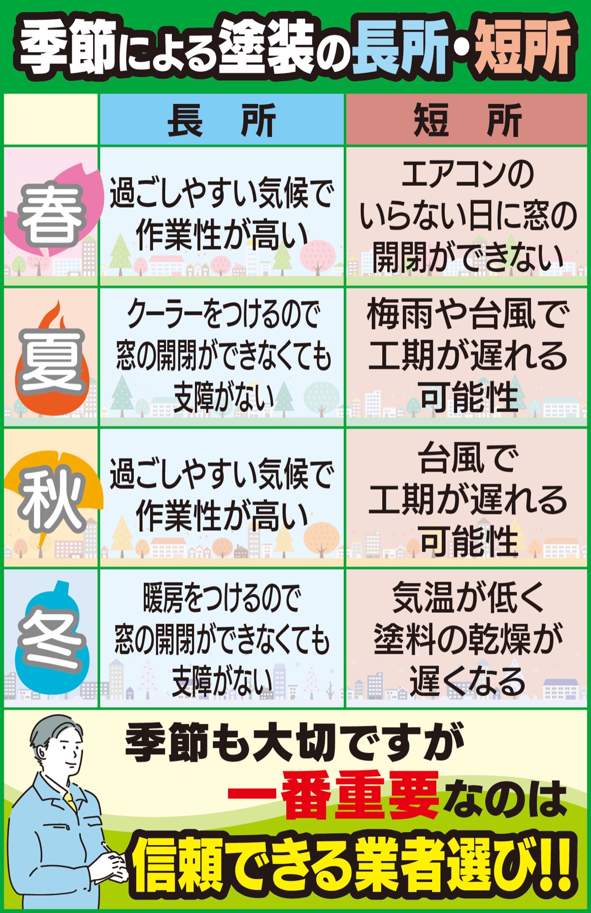 A…色選びと工事時期を決める流れになります。外壁の色はカラーシミュレーションであったり、塗板見本などで色を決めていきます。工事時期については、それぞれの時期のメリット・デメリットがあるので、ご自身の都合の良いタイミングで行うのが良いと思います。