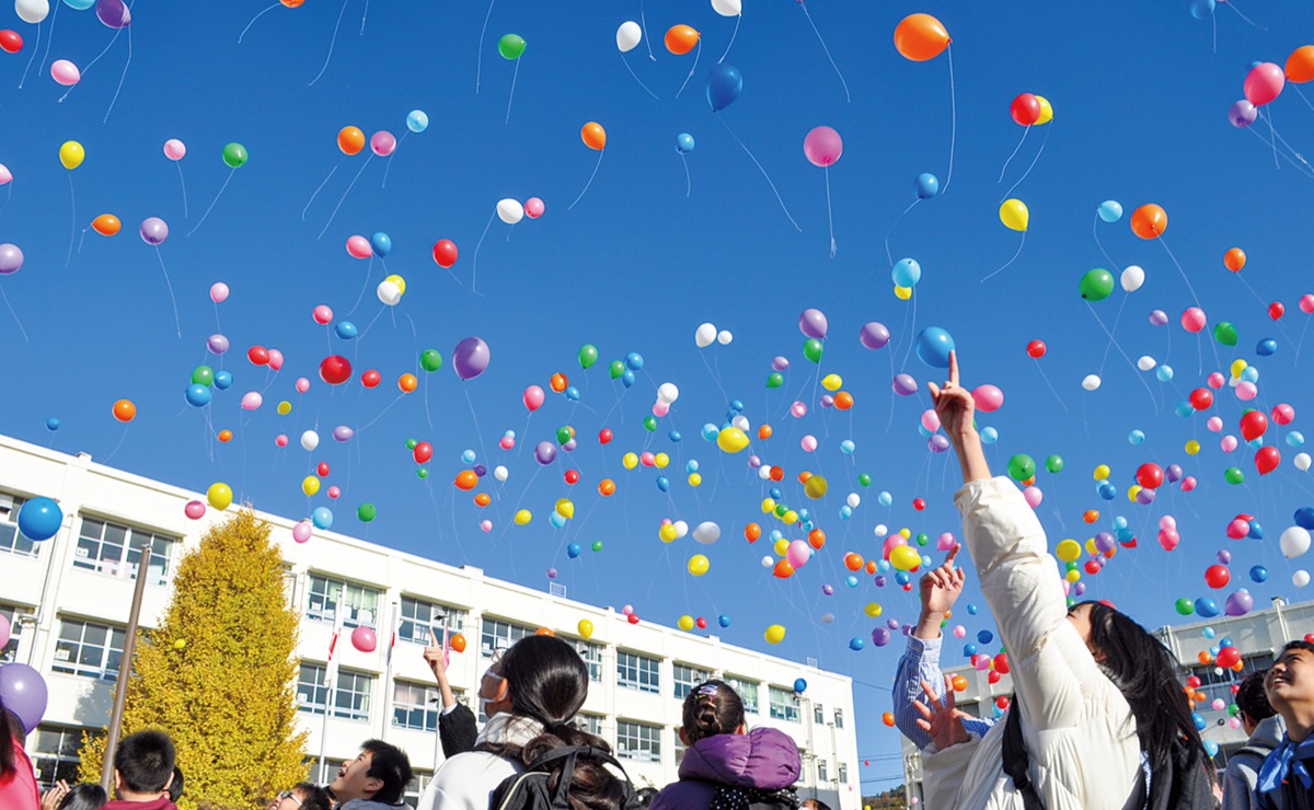 12月9日の記念集会では、バルーンリリースを実施。全校児童に風船が配られ、カウントダウンで一斉に解き放たれると、児童らの思いを載せた色とりどりのバルーンは雲一つない青空に吸い込まれていった。また、まちの学習に協力した地域に住む「まちの先生」たちが招待され、児童らから感謝が述べられた。