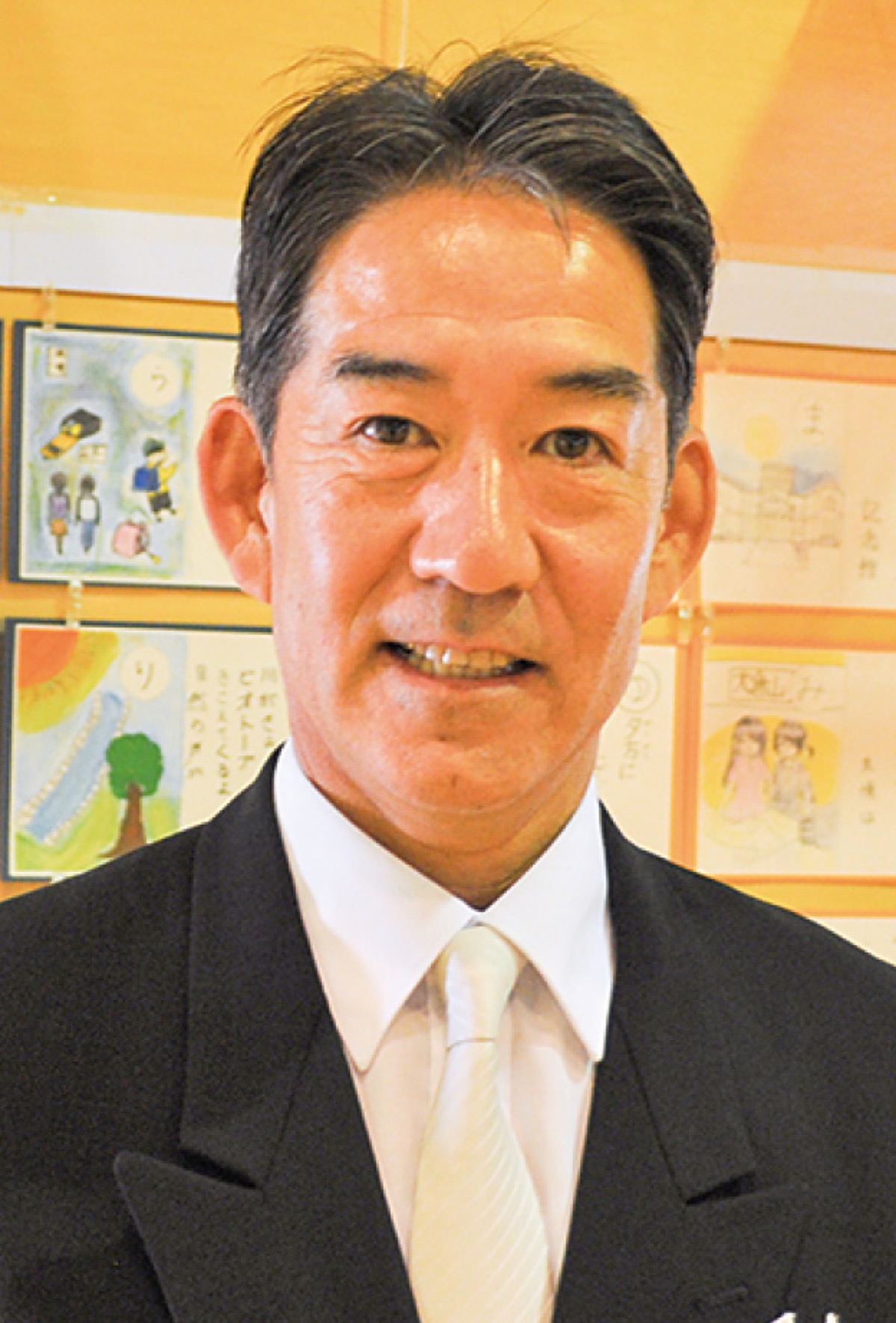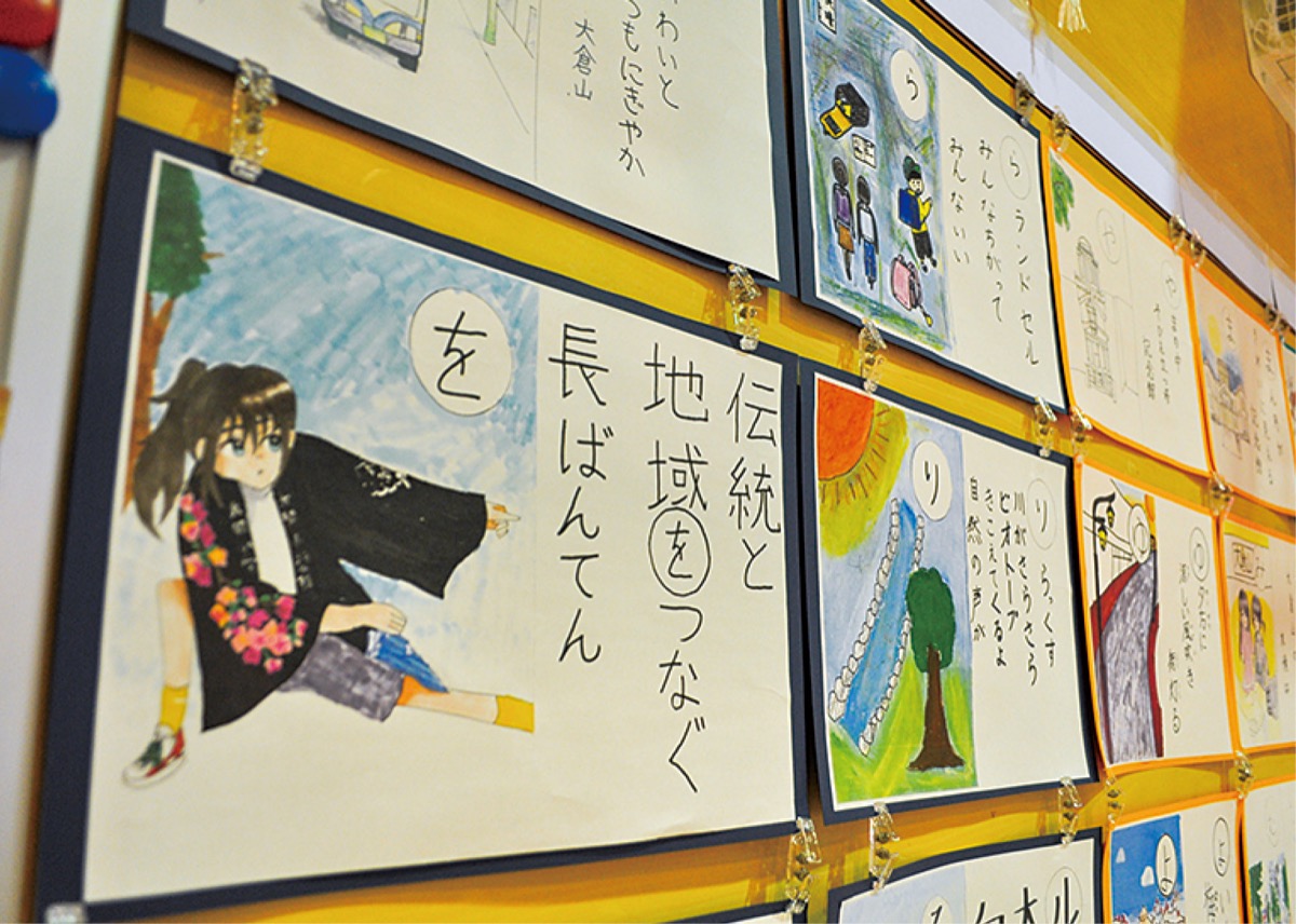 記念式典当日は、会場に「大綱かるた」が飾られた=写真。文字札は46文字のうち、1年生が各クラス1文字ずつ、2年生以上が各クラス2文字ずつを担当。「つみ重ね れきしがいっぱい 大綱小」や「ろく学年 代々築く 大綱魂」「にこにこで 笑顔あふれる 大綱小」など学校のことを読んだものや、「のんびりと レモンロードを 見てまわる」「やまの中 そびえ立つ塔 記念館」「めんがうまい しげとみラーメン 最強だ」など、児童らが「まちの学習」で調べたまちの様子などが表現された文が書かれ、それに合わせた絵札が作られた。