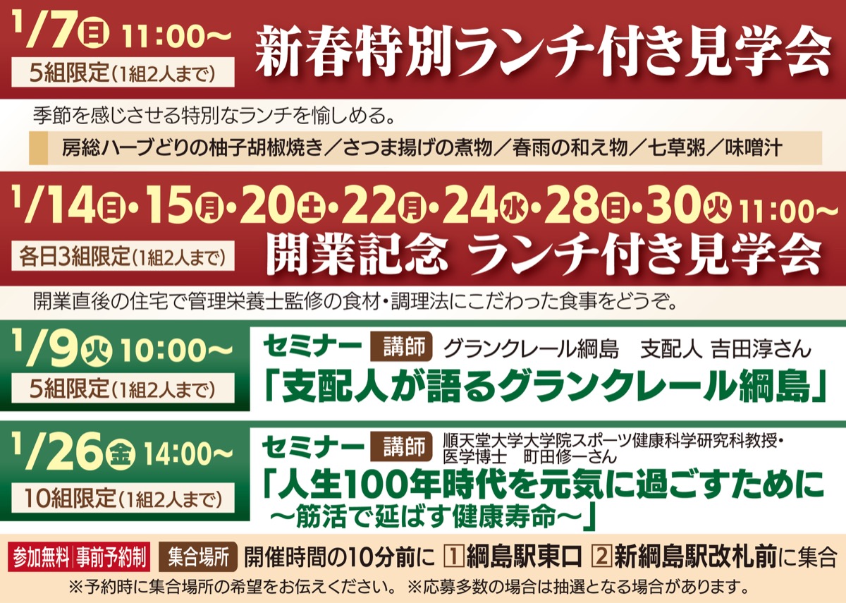 管理栄養士監修の手作り料理が朝昼晩と食べられるダイニング(予約制/有料)も魅力。1月はランチ付き見学会を多数開催予定なので、ぜひその食事の美味しさも体験を。無料セミナーも随時実施しているので、ホームページで確認を。