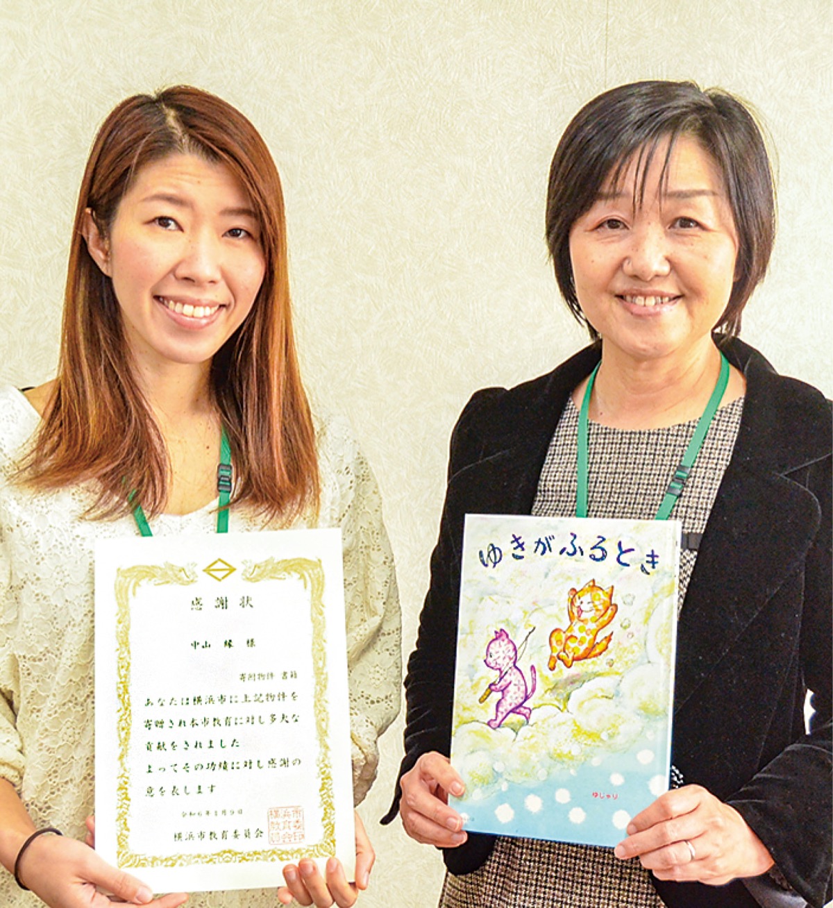新羽町在住の絵本作家、ゆじゃりさん(本名・中山縁さん)が昨年末に区内26の小学校に自身が手がけた著書を寄贈したことを受け、1月9日、新羽小学校で横浜市教育委員会からの感謝状の贈呈式が行われた。