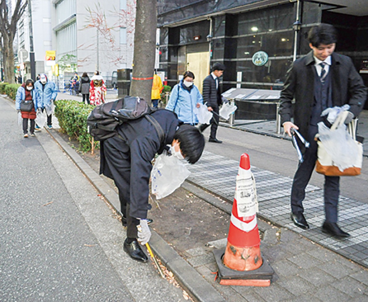 新横浜町内会のハマロードサポーター委員会(伊東厚彦委員長)は、1月8日の成人の日、横浜アリーナで行われた「二十歳の市民を祝うつどい」への参加者とともに、アリーナ通りで清掃活動を実施した。