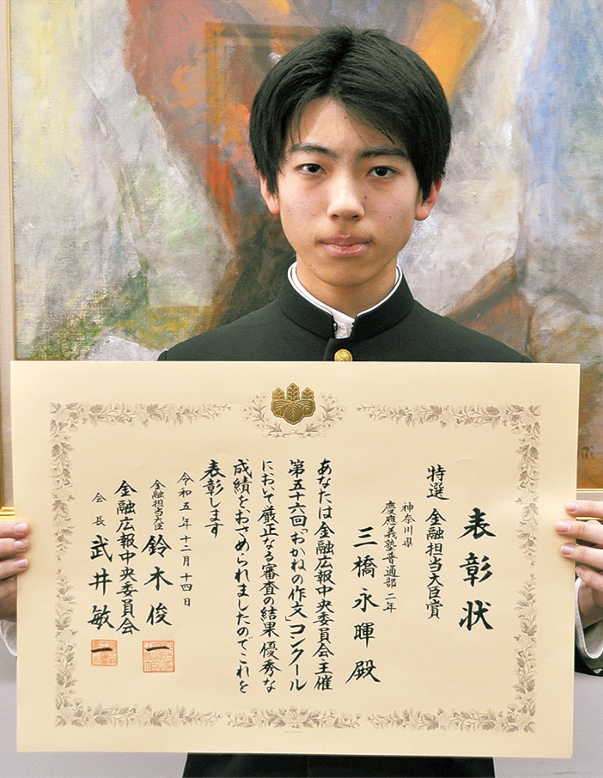 金融広報中央委員会が主催する第56回「おかねの作文」コンクールが先ごろ行われ、慶應義塾普通部=日吉本町=の三橋(みはし)永暉(えいき)さん(2年)が特選・金融担当大臣賞を受賞した。1月23日には、同校で表彰式が行われた。