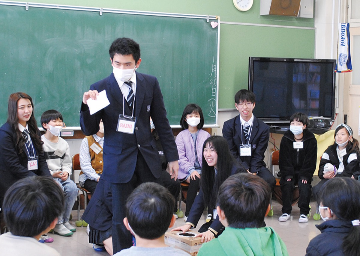 生徒は2クラスに分かれ、「What 〜 do you like?(何の〜が好きですか?)」の使い方を教えた。日本語を話さないという条件に苦戦する場面も見られたが、ジェスチャーなど工夫を凝らし、笑顔で子どもたちと交流していた。「初めて教える立場になって、うまく伝わらない難しさを感じた」と髙瀬ゆきさん。中村七海さんは「ゲームを楽しみながら発音など学べるように工夫した。ペアで協力しやすい内容にした」と話していた。